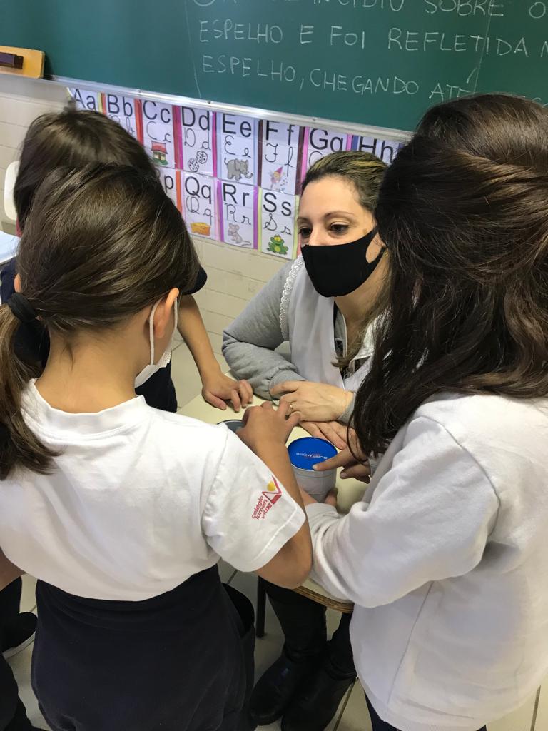Os alunos do 2º ano realizaram uma atividade prática de Ciências para descobrir se o calor do Sol aquece todas as superfícies da mesma forma, utilizando latas encapadas nas cores branca e preta. Colocamos uma pedra de gelo em cada uma, levamos ao sol e observamos por cerca de 30 minutos.