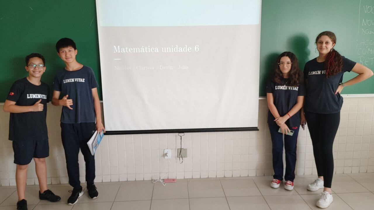 Agora é a vez deles! Com a proposta de “aula invertida”, a professora Elisabete de Matemática, propôs uma dinâmica onde os alunos é que ministraram a aula. Reunidos em grupos e cada um tratando de um tema a respeito da disciplina, os estudantes do 8º ano arrasaram nas apresentações, ou melhor, nas aulas!
