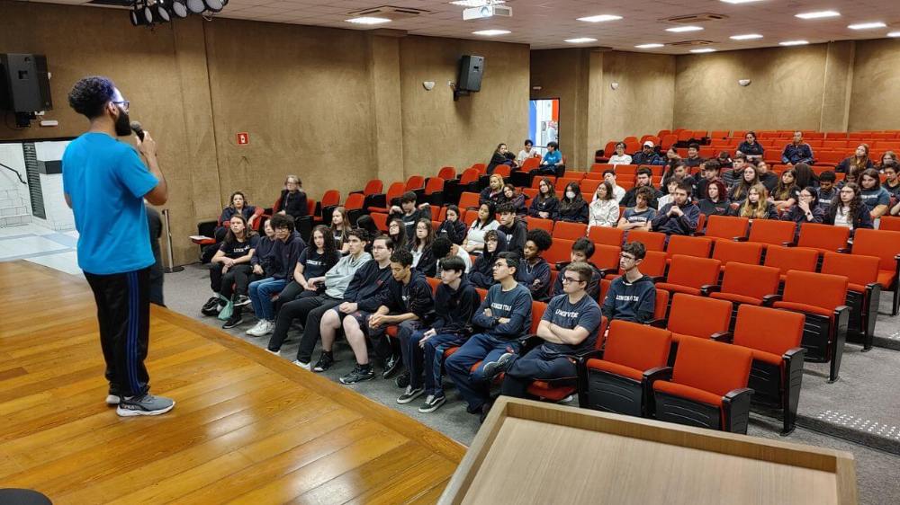 Os estudantes do Ensino Médio participaram de um bate-papo a respeito de aspectos importantes para a vida acadêmica: a preparação para os diferentes vestibulares, a escolha do curso e a carreira profissional. A conversa foi realizada pelo estudante da USP e representante da FUVEST (Fundação Universitária para o Vestibular), Fagner de Souza (@fagdesouza). Os alunos tiveram a oportunidade de ouvir um pouco da sua experiência como aluno da Universidade São Paulo, tirar dúvidas sobre o tema abordado e conhecer um pouco mais sobre o contexto dos vestibulares da USP, Unesp e Fuvest: inscrições, datas, preços, tempo de prova e as diferentes fases dos vestibular.