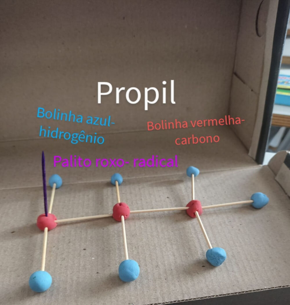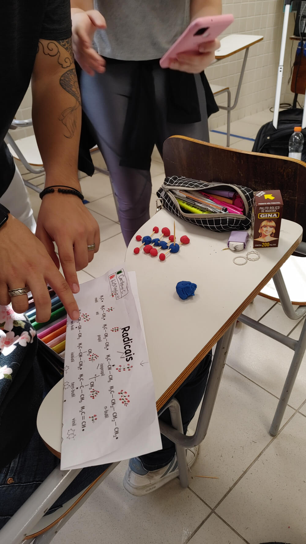 Durante as aulas de Química, os estudantes da 3ª série do Ensino Médio tiveram oportunidade de construir maquetes das moléculas dos radicais orgânicos que estudaram nas aulas. As maquetes foram fotografadas por eles e serão utilizadas durante a resolução de exercícios sobre o tema. Essa nova visão do conteúdo estudado amplia o aprendizado e proporciona novas experiências.