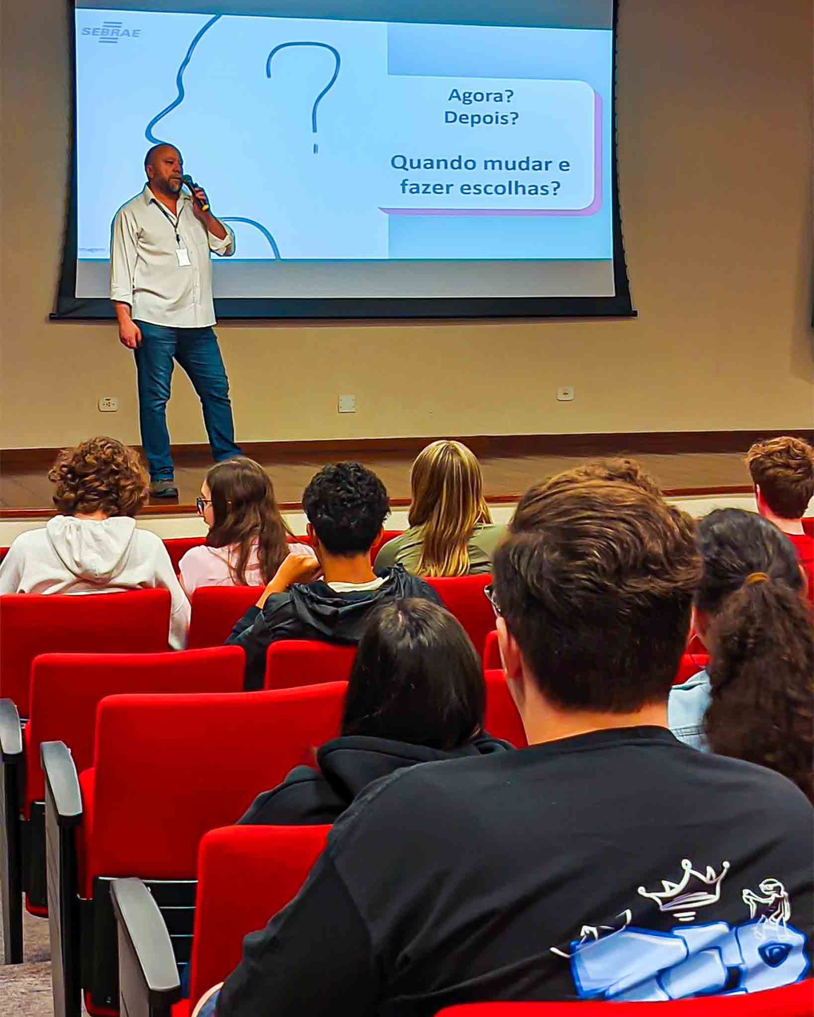 Hoje, os alunos do Ensino Médio participaram de uma palestra com o SEBRAE, discutindo escolhas de vida e como identificar caminhos que alinhem seus projetos pessoais e profissionais.